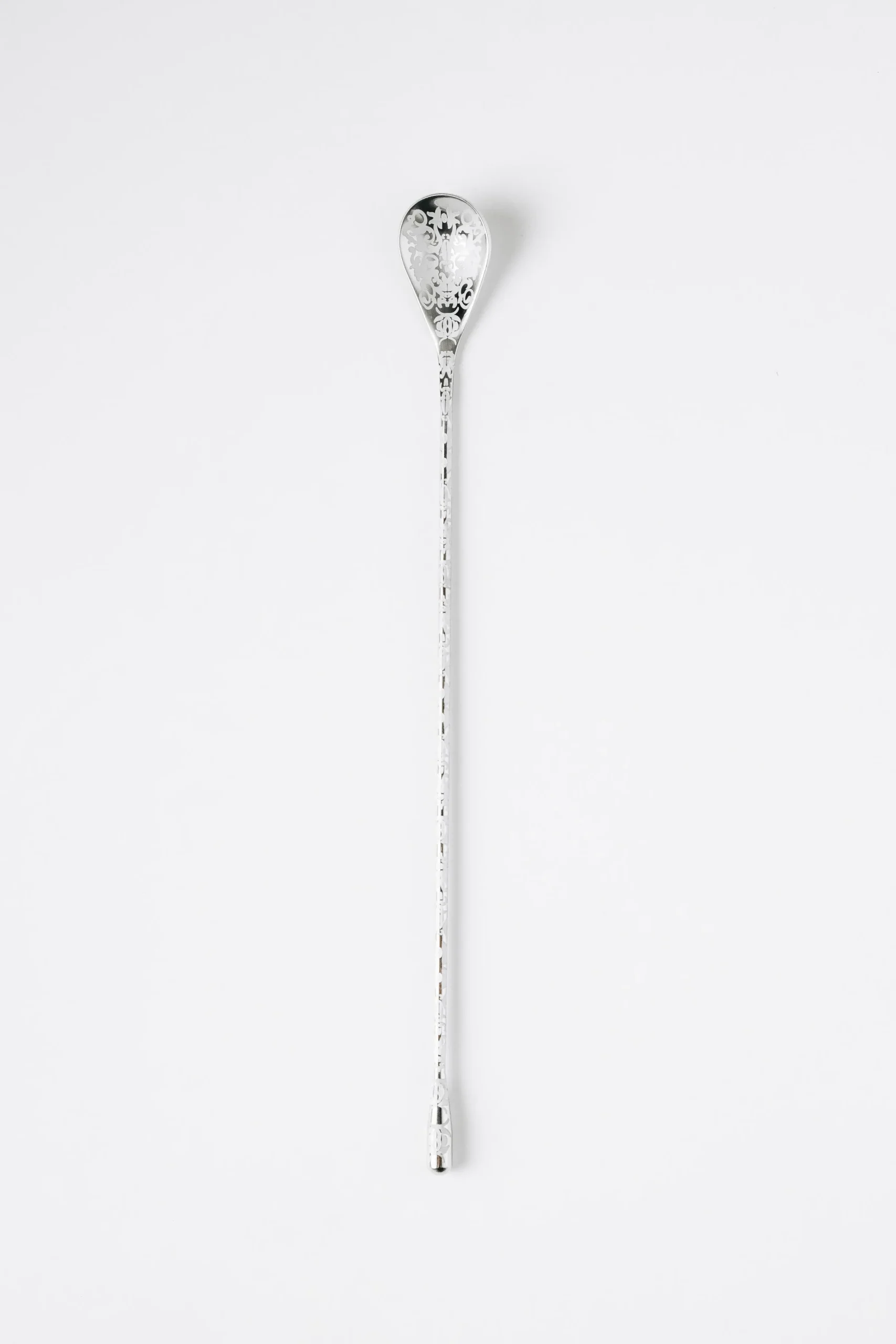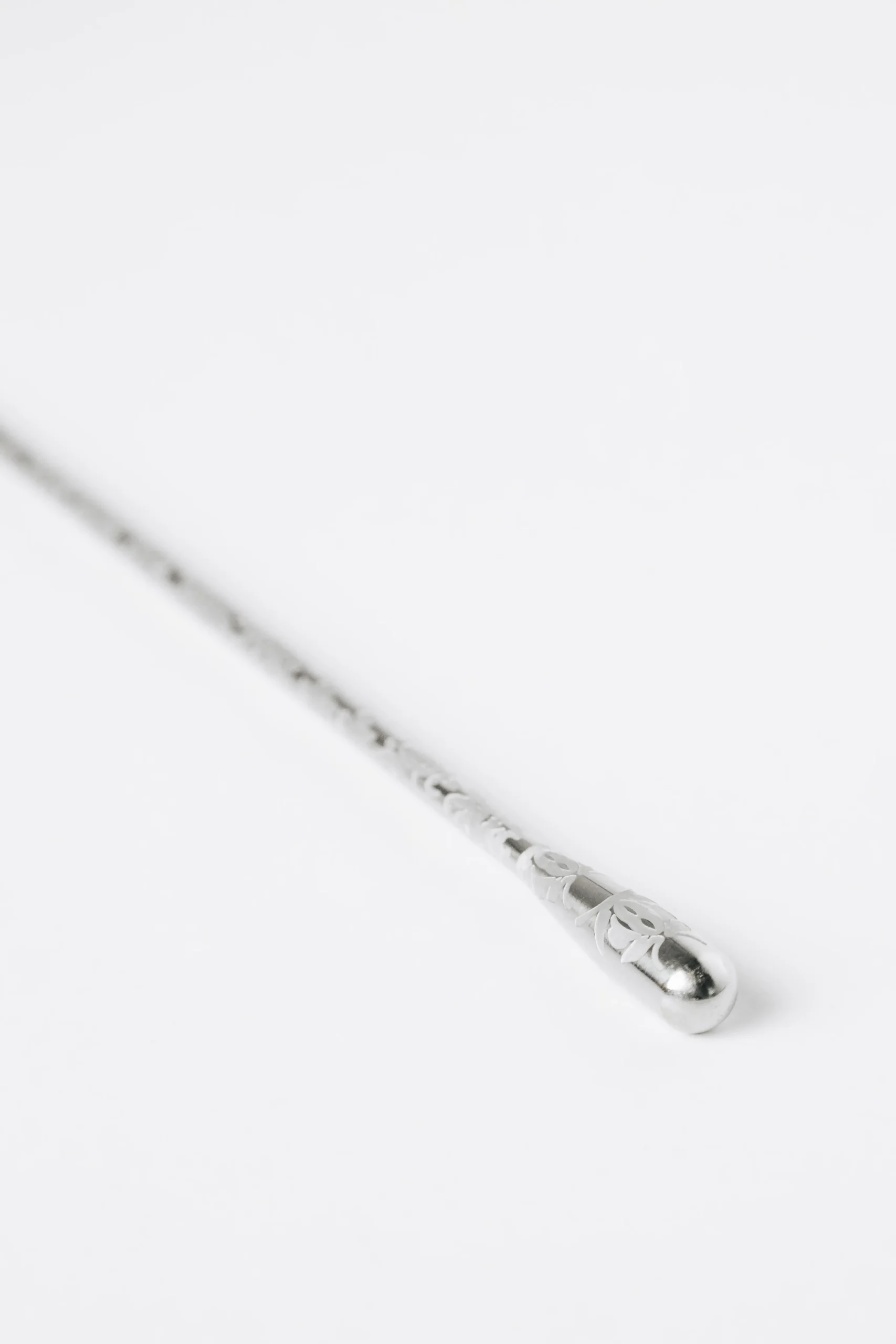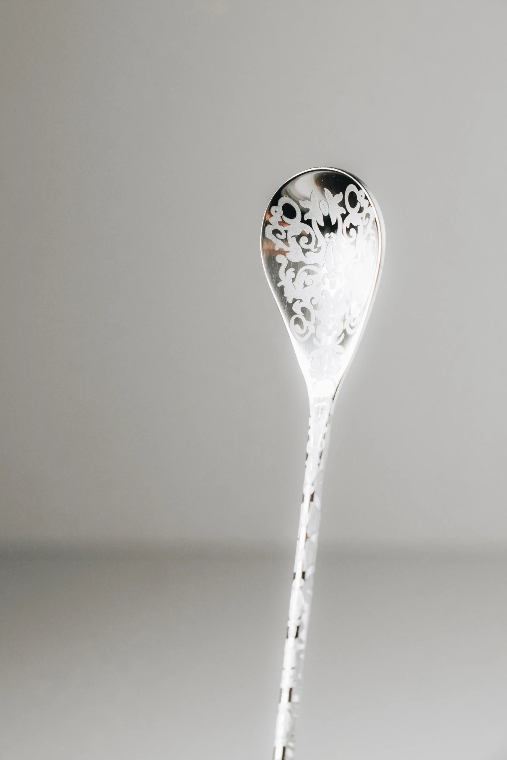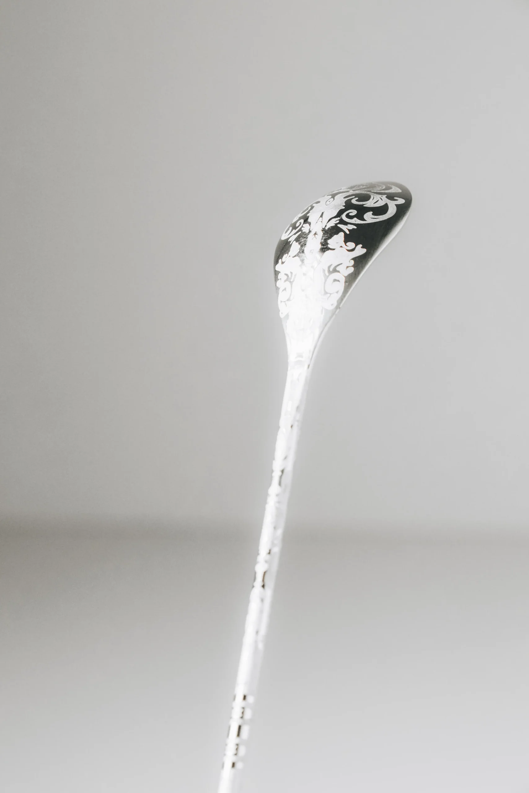 Eleganter Barlöffel aus Edelstahl mit fein graviertem Muster – das ideale Werkzeug zum Rühren und Schichten von Cocktails. Mit 30 cm Länge perfekt geeignet für Longdrinks, hohe Gläser und Rührgläser.