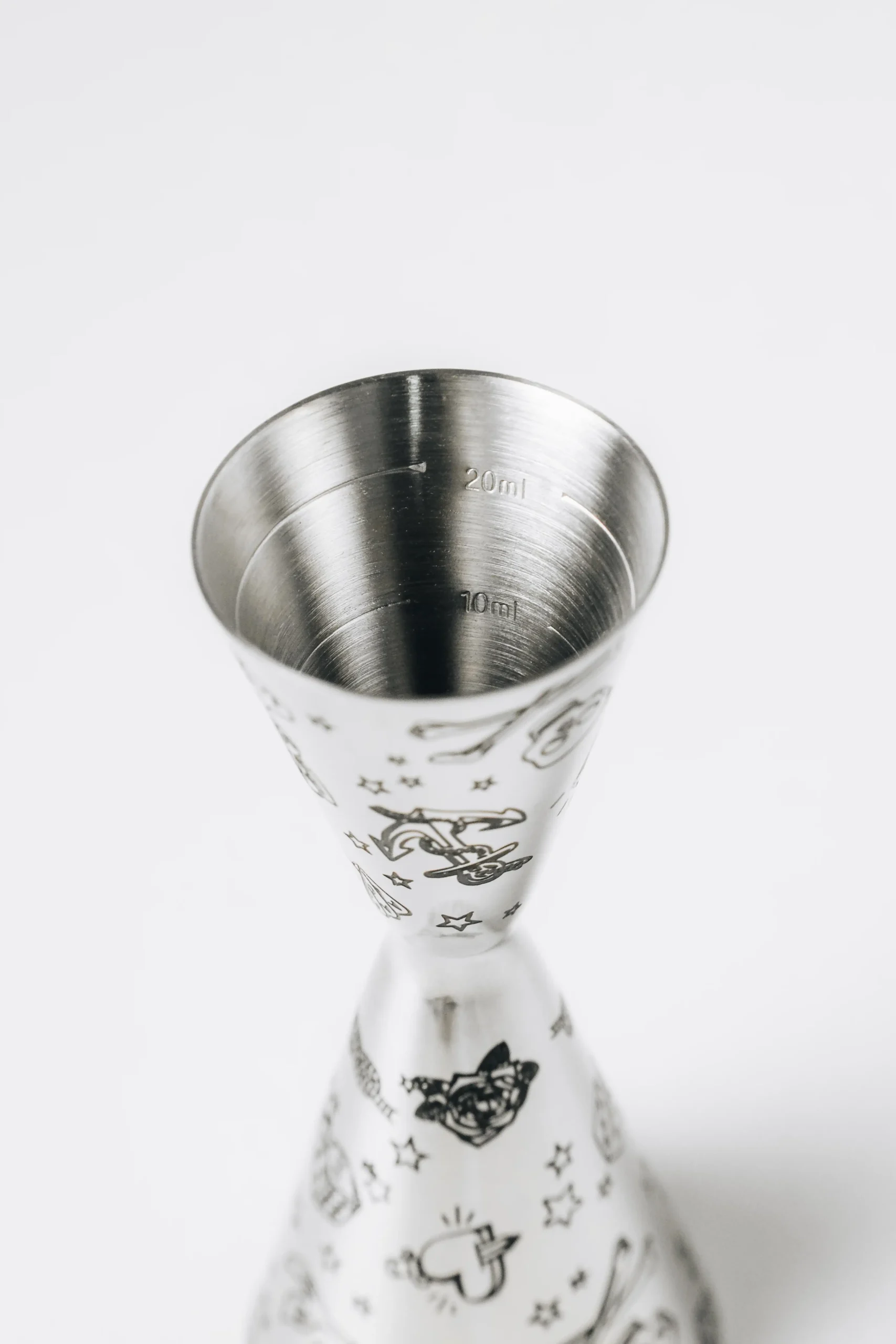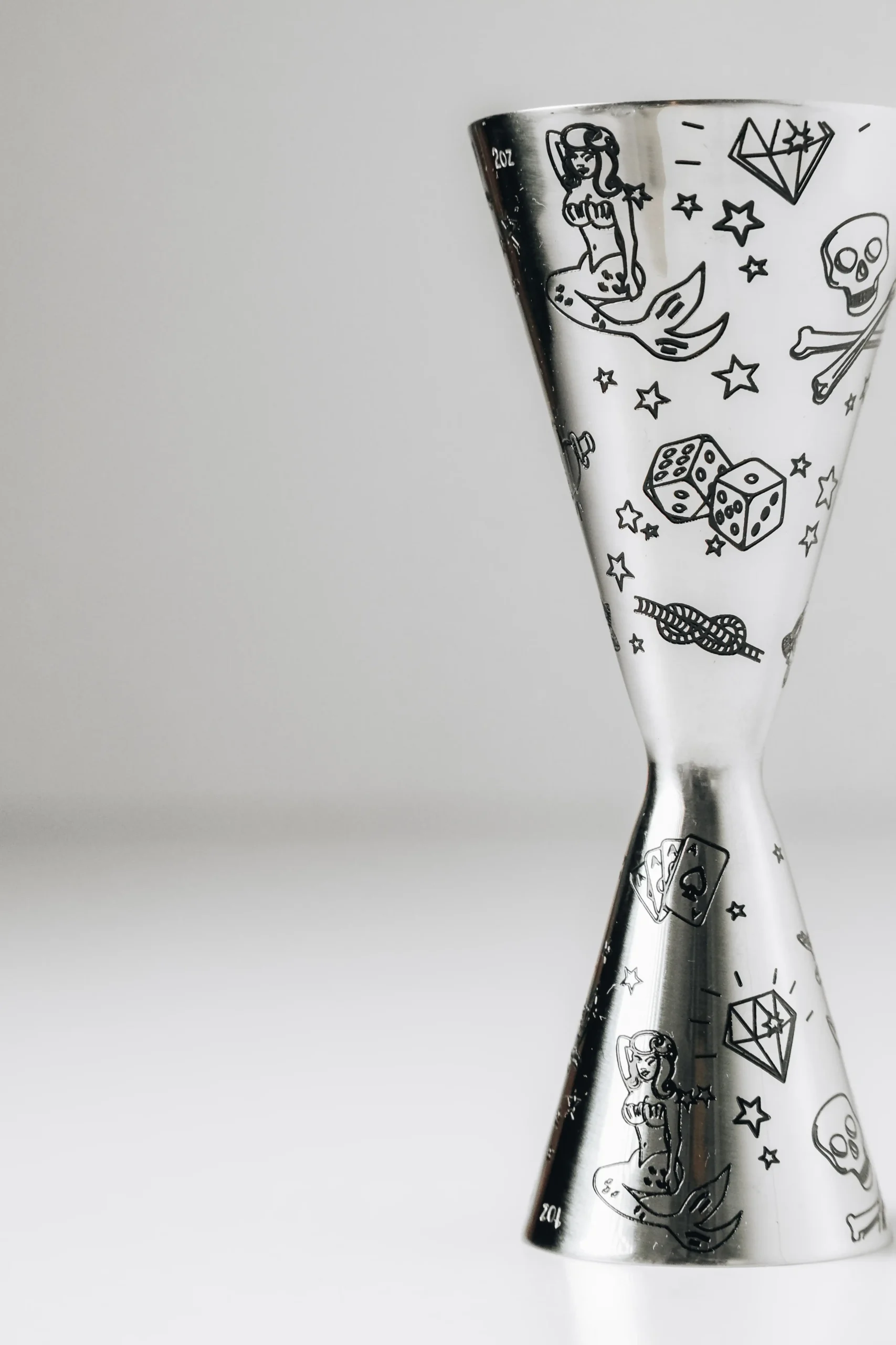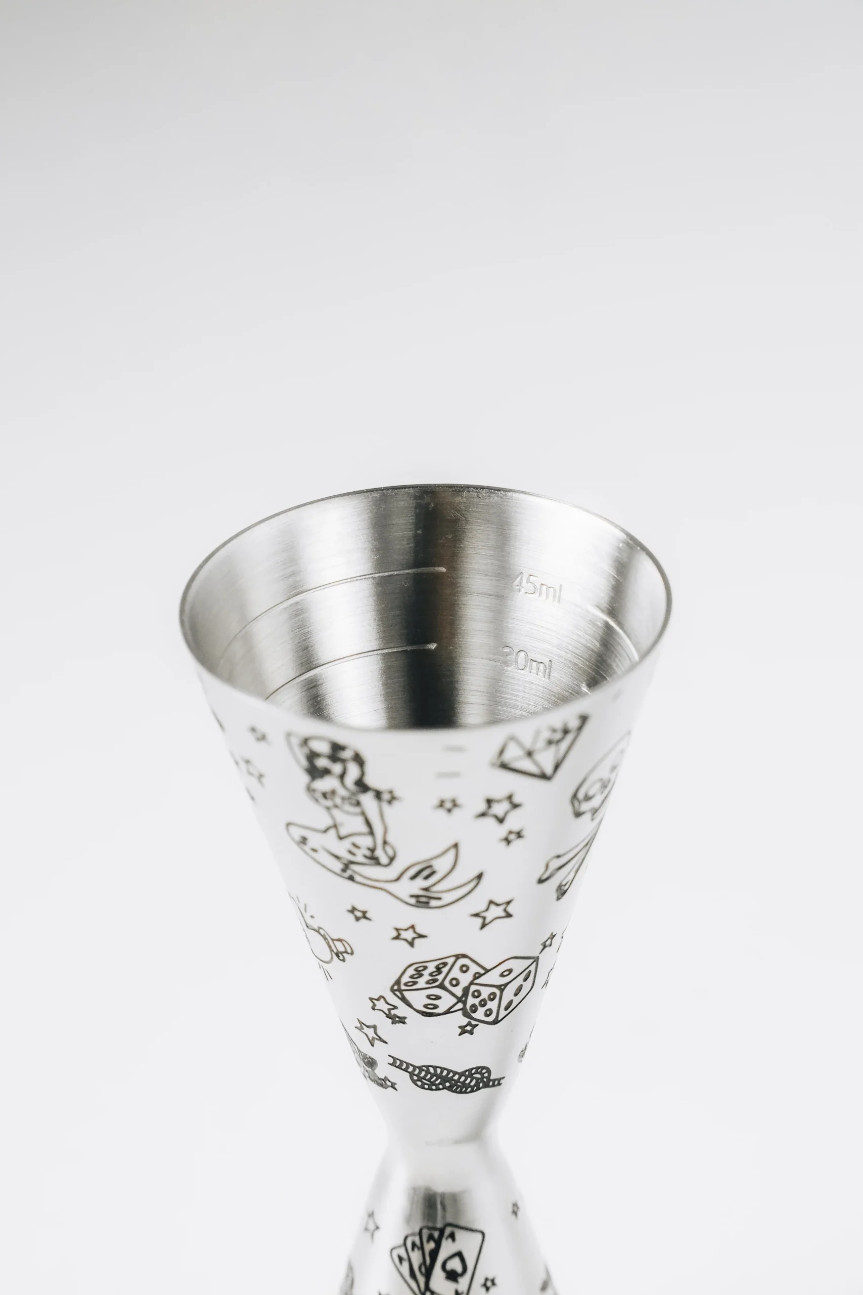 Edler Jigger im gleichen geätzten Design wie unsere Boston Shaker – gefertigt aus hochwertigem Edelstahl 304. Mit 30 ml und 60 ml Seiten sowie praktischen Innen-Markierungen für präzises Abmessen.