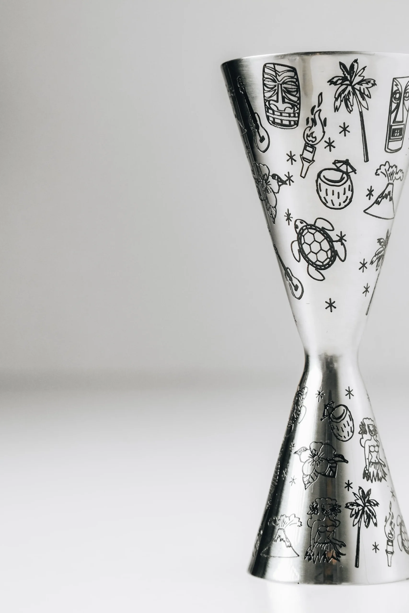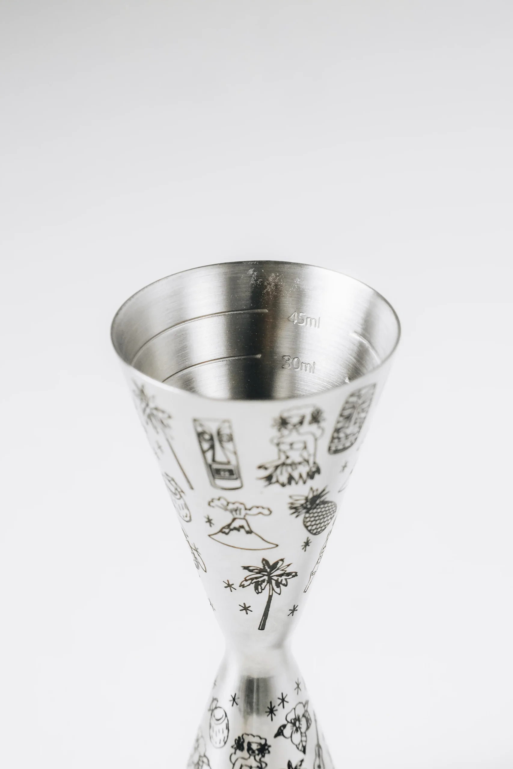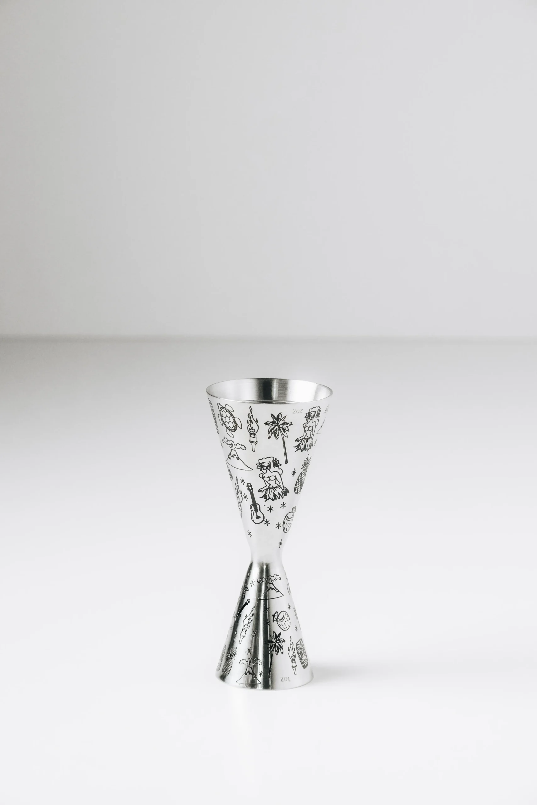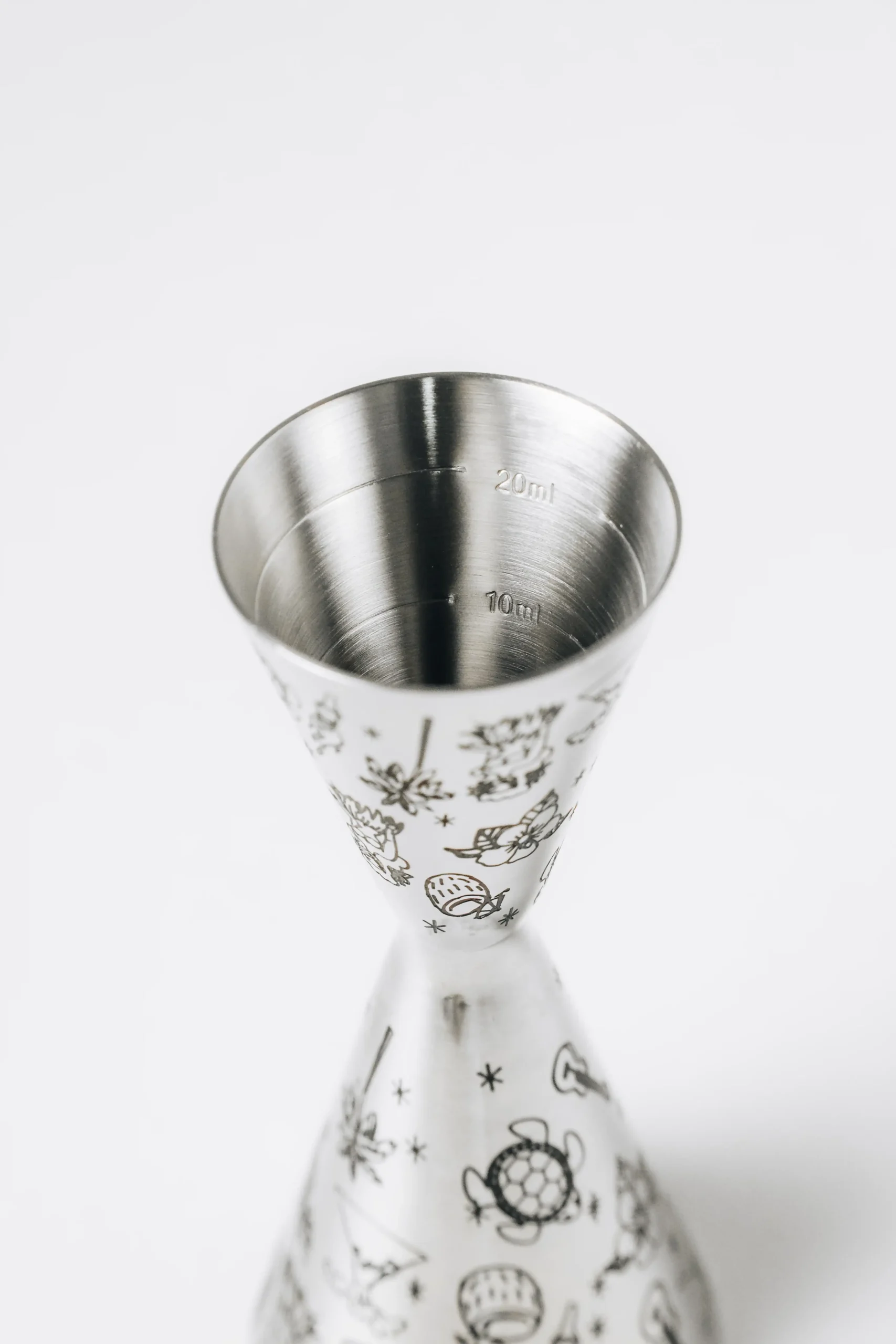 Edler Jigger im gleichen geätzten Design wie unsere Boston Shaker – gefertigt aus hochwertigem Edelstahl 304. Mit 30 ml und 60 ml Seiten sowie praktischen Innen-Markierungen für präzises Abmessen.